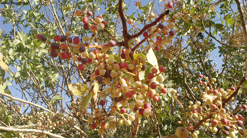 « و این اوست که از ابر باران میفرستد، با آن جوانه های انواع رستنیها را در میآوریم، و از جوانه ماده سبز را درمی آوریم، که با آن ماده سبز دانه های خوشه ای درست میکنیم، و از تاره های نـخل پَـنگهای خـوردنی درست می کنیم، و باغهای انگور و زیتون و انار که ترکیبات مشترک زیادی دارند ولی همانند نمائی نمی کنند را درست می کنیم».